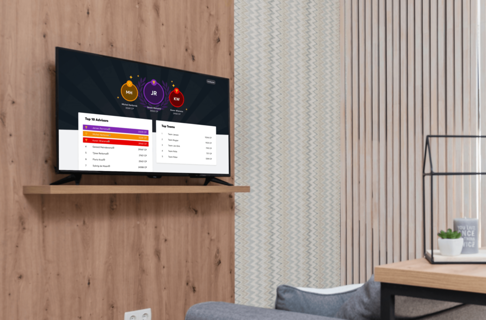 Wie zijn de échte toppers binnen het bedrijf? Welke teams presteren het best? Door middel van een op maat gemaakt leaderboard kan je op een leuke en speelse manier zien wie het beste gepresteerd heeft. Niet alleen op je computerscherm, maar ook op de tv schermen wordt dit leaderboard gepresenteerd. Want geef toe: een beetje competitie is altijd leuk, toch?