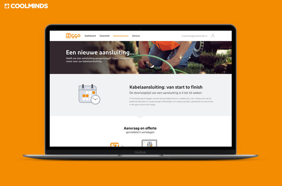 Samen met Ziggo ontwikkelde Coolminds daarom de portal kabelaansluiting.ziggo.nl. Deze portal biedt aannemers het gemak van het online indienen van een aanvraag. Ook de voortgang van alle werkzaamheden is volledig inzichtelijk. Een uitdrukkelijke wens van de eindgebruikers.